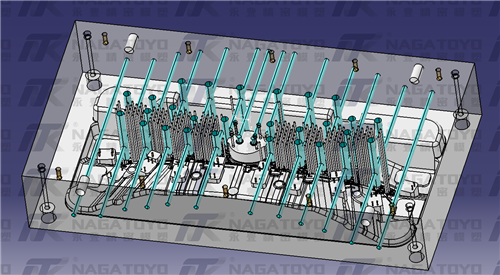 3.水路的水管盡量避免與模具上的其他結構(例如:頂桿、司筒、斜頂、小鑲件、側邊抽芯、定距分型結構)發(fā)生干涉